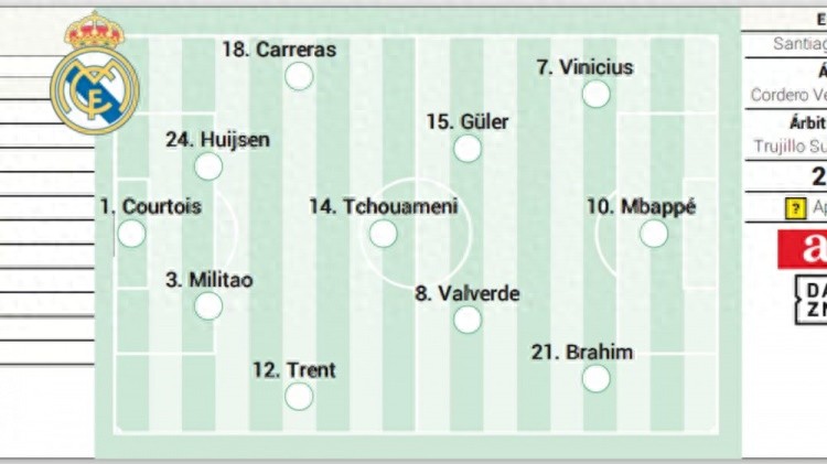 ngày 19 tháng 8 trong vòng đầu tiên của La Liga, Real Madrid sẽ đối mặt với Osasuna tại nhà. Trước trò chơi, Ass truyền thông Tây Ban Nha đã dự đoán danh sách bắt đầu của trò chơi này. Ferran Mendy, Rudiger (bị đình chỉ do thẻ đỏ trong trận chung kết Cup del Rey), Camavenga, Bellingham và Enderick đã vắng mặt, và Valverde trở lại.