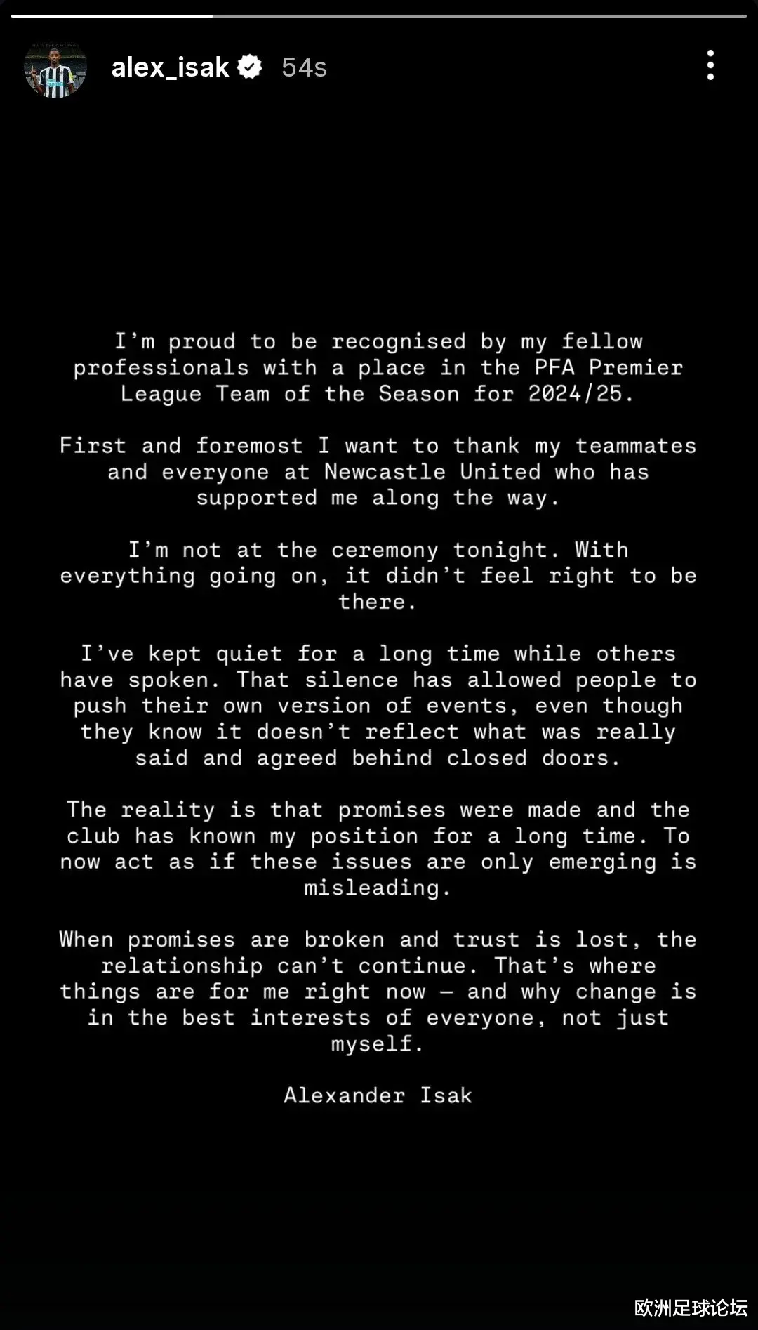 Sáng nay, Isaac ban đầu được mời tham dự lễ trao giải hàng năm của Liên minh Anh (PFA) của Người chơi chuyên nghiệp (PFA) được tổ chức tại Manchester. Nhưng cuối cùng anh ta đã không xuất hiện và cũng đưa ra một tuyên bố cá nhân bùng nổ trên phương tiện truyền thông xã hội về cuộc xung đột của anh ta với Newcastle. Văn bản đầy đủ như sau ↓