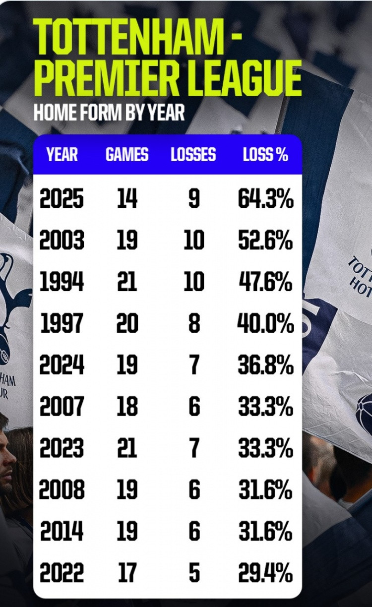 Ngày 7 tháng 11 Theo thống kê của Opta, Tottenham đã thi đấu 14 trận sân nhà ở Premier League năm nay và thua 9 trong số đó. Tỷ lệ thua trên sân nhà là 64,3%, tỷ lệ thua tự nhiên trong năm cao nhất tại Premier League trong lịch sử đội bóng.