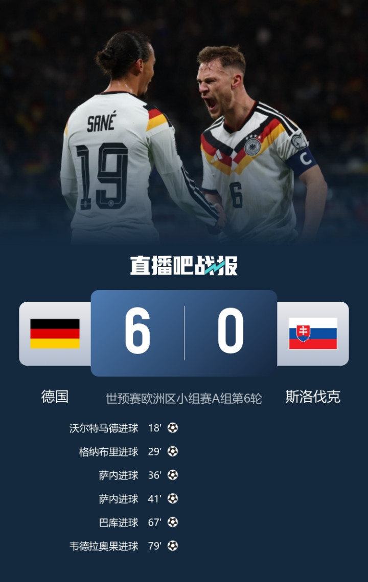 Ở lượt thứ sáu bảng A vòng bảng châu Âu của vòng sơ loại World Cup, Đức đánh bại Slovakia với tỷ số 6-0 và Sane lập cú đúp.