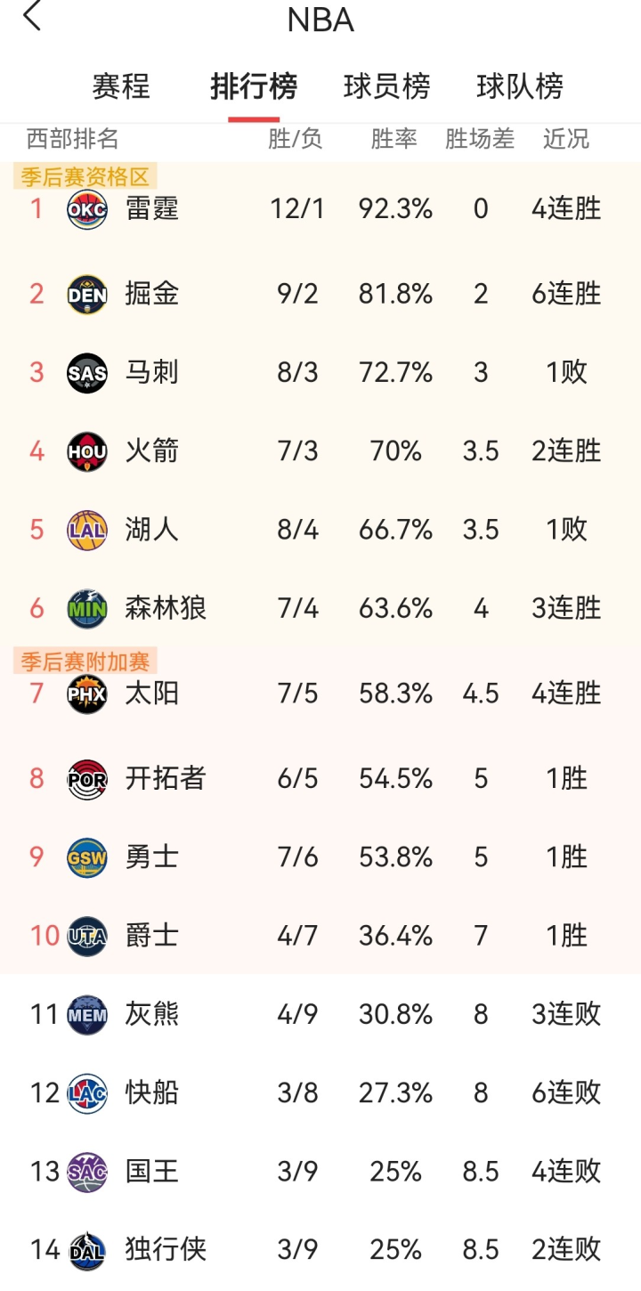 NBA đã lên lịch tổ chức 12 trận đấu, trong đó có 8 trận ở Western Conference. Grizzlies đánh bại Celtics với tỷ số 95:131, và Rockets đánh bại Wizards với tỷ số 135:112, vượt qua Lakers và vươn lên vị trí thứ tư tại Western Conference, xếp sau Spurs. Trail Blazers đánh bại Pelicans 125:117, Warriors 125:120 khiến Spurs, đội đứng thứ ba ở Western Conference, Suns đánh bại Mavericks 123:114, Lakers thua thảm hại trước Thunder 92:121, tụt xuống thứ năm ở Western Conference, Kings thua Hawks 100:133, và Clippers 116:130 Họ thua the Nuggets và trải qua chuỗi sáu trận thua. Cùng nhìn lại kết quả và bảng xếp hạng mới nhất tại Western Conference: