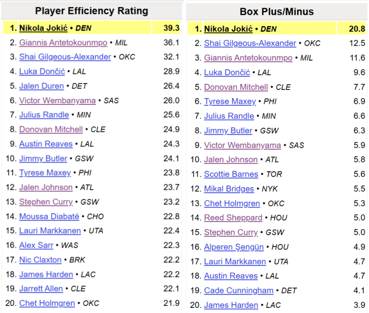 Lý do chính là hiệu suất và sức mạnh của Nuggets đã được cải thiện so với mùa giải trước và hiệu suất ròng hiện tại của họ chỉ đứng sau Thunder. Đối với Thunder, giá trị bật/tắt của Alexander đã giảm so với mùa giải trước. Mặt khác, Jokic vẫn đạt trung bình triple-double mỗi trận và hiệu quả của anh ấy là quá đáng kinh ngạc.